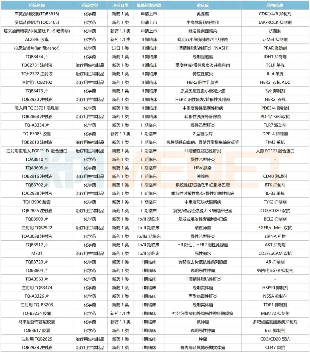 10款1类新药已处于III期临床阶段,上市可期,包括AL2846胶囊(c-Met抑制剂)、拉尼兰诺片(PPAR激动剂)、TQB3454片(IDH1抑制剂)、TQB3473片(Syk抑制剂)、吸入用TQC3721混悬液(PDE3/4抑制剂)5款小分子化学药,以及TQC2731注射液(TSLP单抗)、TQH2722注射液(IL-4单抗)、注射用TQB2102(HER2双抗ADC)、TQB2930注射液(HER2双抗)、TQB2868注射液(PD-1/TGFβ双抗)5款生物药。