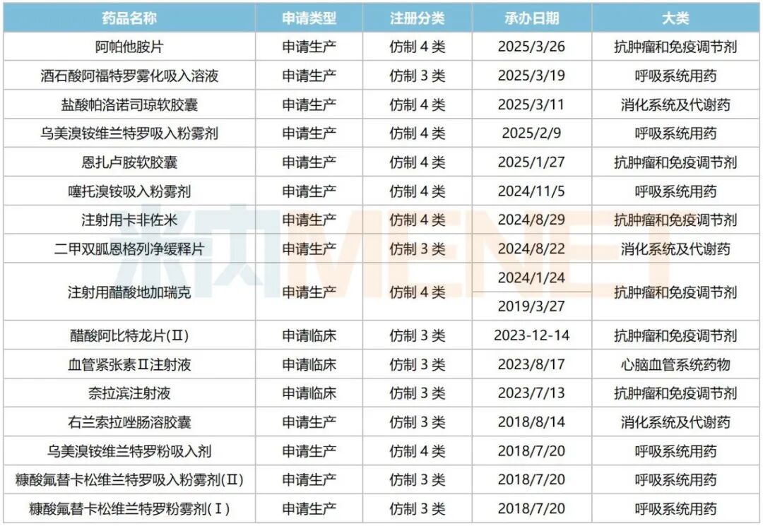 11个品种在国内暂无仿制药获批上市,包括酒石酸阿福特罗雾化吸入溶液、盐酸帕洛诺司琼软胶囊、乌美溴铵维兰特罗吸入粉雾剂、注射用醋酸地加瑞克等,正大天晴药业将与多家企业竞争国内首仿。