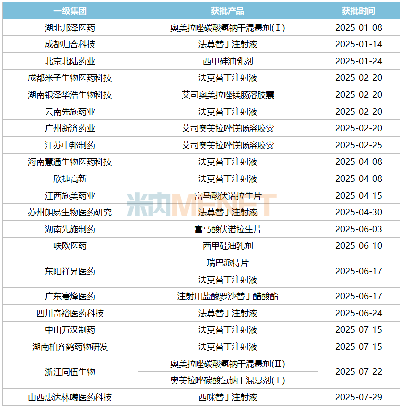 据米内网数据显示,2025年至今累计有超过70个治疗与胃酸分泌相关疾病的新产品获批(按产品名+企业统计),涉及60多家一级集团。江西施美药业、广州新济药业、湖南先施制药等21家一级集团是首次有治疗与胃酸分泌相关疾病的药物获批,成功进入这个300亿市场。