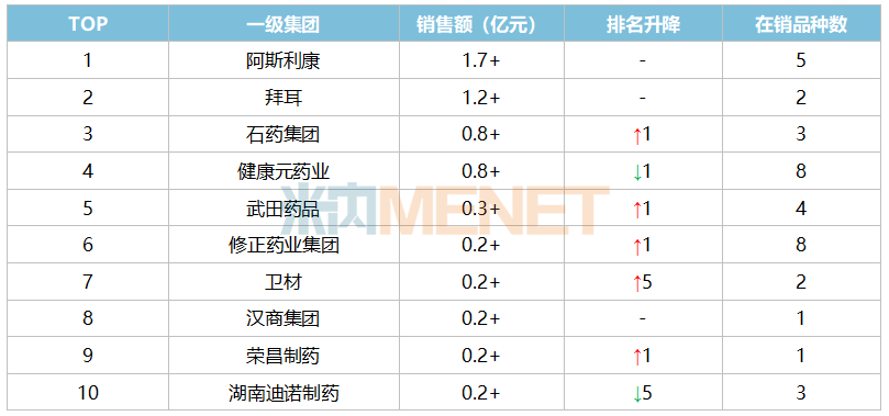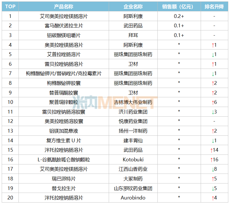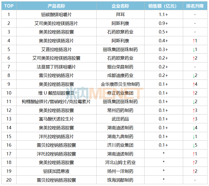 从排名升降来看,石药欧意药业的艾司奥美拉唑镁肠溶胶囊排名上升2位至TOP6,金华康恩贝生物制药的奥美拉唑肠溶胶囊排名上升4位至TOP9,修正药业集团的维U颠茄铝胶囊Ⅱ排名上升2位至TOP10,常州四药制药的奥美拉唑肠溶胶囊排名上升3位至TOP12,湖南迪诺制药的泮托拉唑钠肠溶胶囊排名上升1位至TOP17,河北山姆士药业的奥美拉唑肠溶胶囊排名上升7位至TOP18,扬州一洋制药的铝镁加混悬液排名上升2位至TOP19。