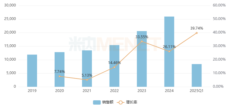 在网上药店,治疗与胃酸分泌相关疾病的药物在2020年起一路飙涨,2022-2024年的增长率分别为6.40%、10.73%、25.61%,2025年Q1大涨35.95%为近四年最大涨幅。