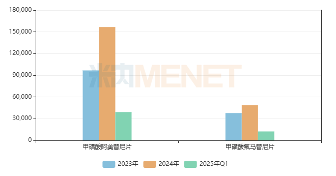 翰森制药的甲磺酸阿美替尼片(2020年获批)和甲磺酸氟马替尼片(2019年获批)均为抗肿瘤国产1类新药。甲磺酸阿美替尼片2023-2024年分别增长了40.66%、62.01%,2024年销售额达到了15.7亿元,2025年Q1再有24.54%的增长;甲磺酸氟马替尼片2023-2024年分别增长了42.79%、28.78%,2024年销售额达到了4.9亿元,2025年Q1再有15.93%的增长。