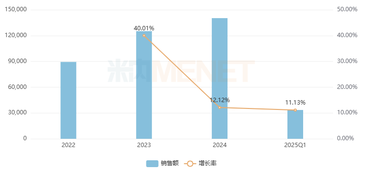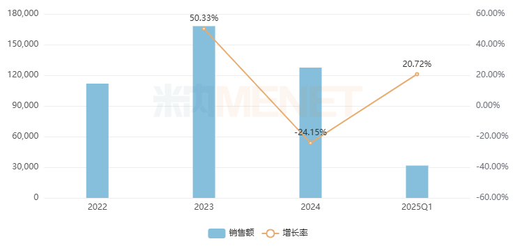 六味地黄丸(浓缩丸)是壮腰健肾药,目前已有超过60家药企获得生产批文,竞争激烈。该产品2022-2024年均在7亿元区间稳步上涨,2025年Q1大涨超过21.06%,是过亿非独家中成药中涨幅最大的产品,太极集团重庆中药二厂(+106.71%)、九芝堂、北京同仁堂科技制药(+12.02%)是该产品TOP3企业。