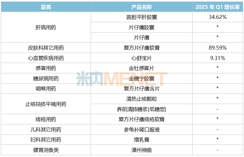 2025年Q1在零售药店终端,片仔癀是中成药肝病用药TOP1集团(一级),独家产品片仔癀(锭剂)为公司在该亚类市场贡献了超过92%的业绩,片仔癀胶囊和茵胆平肝胶囊也贡献了超过3%的业绩,其中茵胆平肝胶囊的销售额增长率高达34.62%。