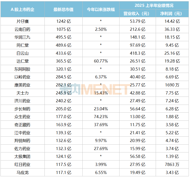 2025年9月8日收盘,A股中药企业TOP20市值的门槛在110亿元以上,千亿市值有片仔癀和云南白药,有11家今年以来涨幅为正,包括了云南白药、达仁堂、以岭药业、天士力、步长制药、众生药业、奇正藏药、羚锐制药、佐力药业、红日药业、马应龙。