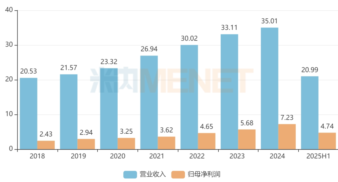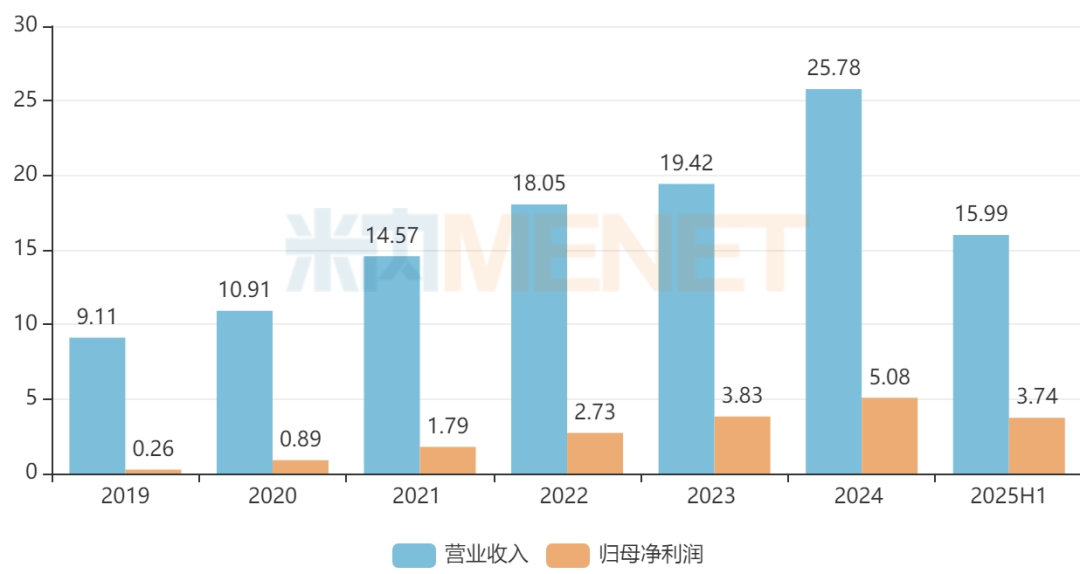 2025年上半年,佐力药业营收15.99亿元,同比增长11.99%;归母净利润3.74亿元,同比增长26.16%。2019年-2025年上半年,公司营收、归母净利润始终保持双增长,其中净利润的增速均为两位数,经营业绩稳中有进。