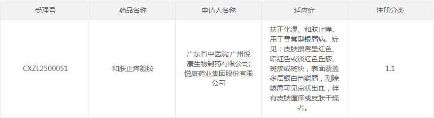 和肤止痒凝胶是由广东省中医院和悦康药业联合开发的中药1.1类新药,具有扶正化湿、和肤止痒的功效,拟用于寻常型银屑病,症见:皮肤损害呈红色、暗红色或淡红色丘疹、斑疹或斑块,表面覆盖多层银白色鳞屑,刮除鳞屑可见点状出血,伴有皮肤瘙痒或皮肤干燥者。