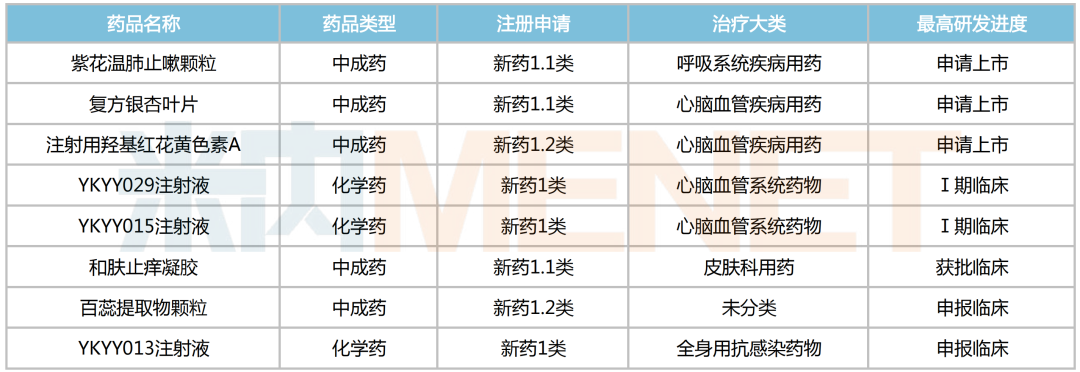 8款在研1类新药覆盖呼吸、心脑血管、皮肤、感染等疾病领域,其中,注射用羟基红花黄色素A(心脑血管疾病)、紫花温肺止嗽颗粒(感染后咳嗽)、复方银杏叶片(血管性痴呆)已报产在审,YKYY015注射液(高胆固醇血症、高血脂症)、YKYY029注射液(高血压)已步入Ⅰ期临床,和肤止痒凝胶(银屑病)已获批临床,百蕊提取物颗粒、YKYY013注射液已申报IND。