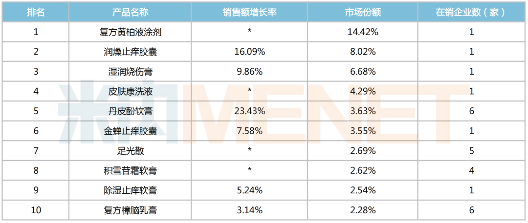 产品TOP10方面,复方黄柏液涂剂以近5亿元的销售额稳居榜首;润燥止痒胶囊、湿润烧伤膏先后位居第二和第三,销售额均超2亿元;皮肤康洗液、丹皮酚软膏、金蝉止痒胶囊分别排在第四、第五和第六,销售额均在1亿元以上。