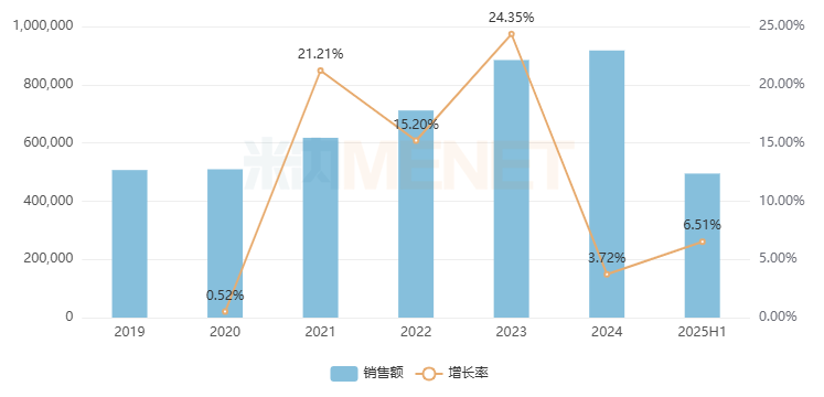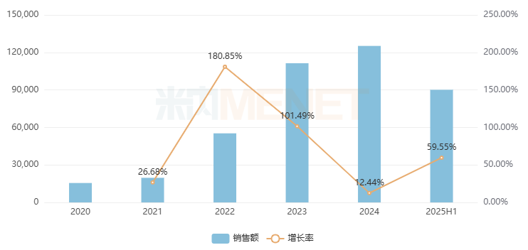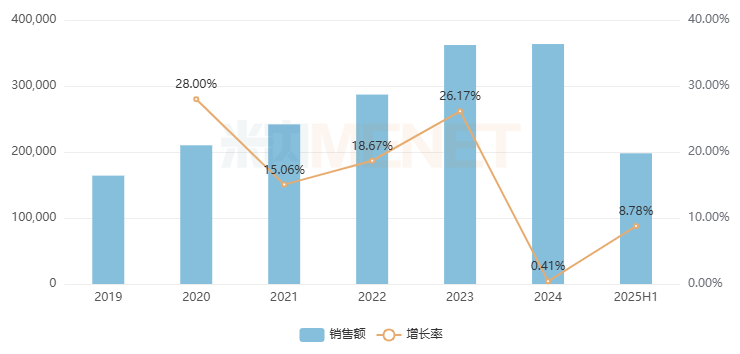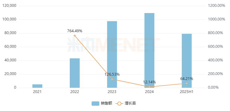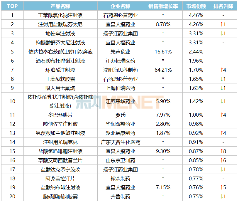 环泊酚注射液是海思科医药在2020年获批的麻醉剂1类新药,2021年进入国家医保谈判目录后在中国公立医疗机构终端实现销售大放量,2024年销售额首破10亿元,2025上半年增长率高达64.21%,是TOP20中增幅最大的品牌,品牌排名也是首次挺进TOP7新高位。