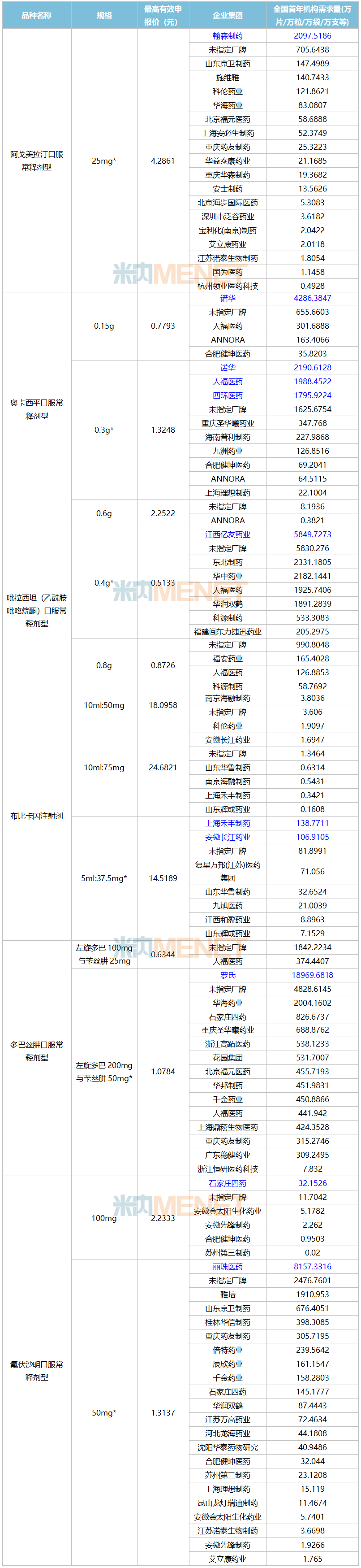 多巴丝肼片是抗帕金森氏病药,2024年在中国三大终端六大市场的销售额超过11亿元。本次的采购规模在3.5亿元左右,其中左旋多巴200mg与苄丝肼50mg为主流规格,原研地产化企业罗氏的全国首年机构需求量超过1.89亿片,绝对领先,留给未指定厂牌的需求量超过了4828万片。