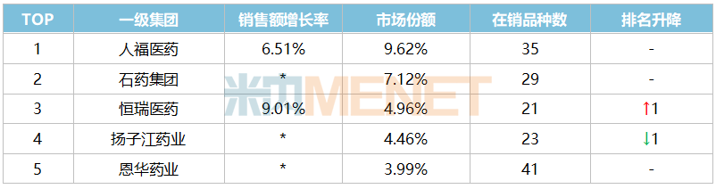 2025上半年该类药物市场继续下滑,降幅为4.52%,销售规模超过了514亿元,TOP20集团(一级,下同)合揽超过57%的份额,市场集中度较高。