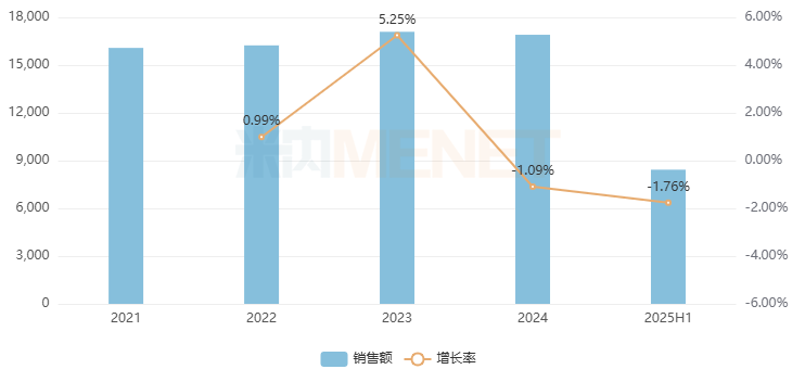 在中国三大终端六大市场(统计范围见文末),化学药、生物药、中成药合计销售额在2023年达到了17000亿元以上,2024年下滑了1.09%,2025上半年跌势未停,降幅为1.76%,合计销售额在8400亿元左右。