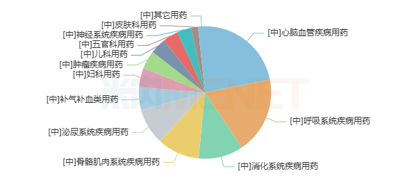 从中成药大类分布情况看,心脑血管疾病用药的占比在22.09%,遥遥领先,2025上半年销售额微跌3.44%;呼吸系统疾病用药、消化系统疾病用药、骨骼肌肉系统疾病用药占比均超过10%,其中呼吸系统疾病用药销售额大跌超过11%,该大类市场陷入了危机。