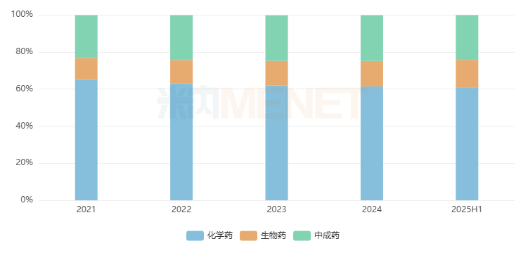 整体来看,近几年在中国三大终端六大市场,化学药的占比一直保持在六成以上,2025上半年为60.64%,中成药的占比保持在23%至24%左右,生物药的占比则有稳步增长态势,2025上半年升至15.03%。