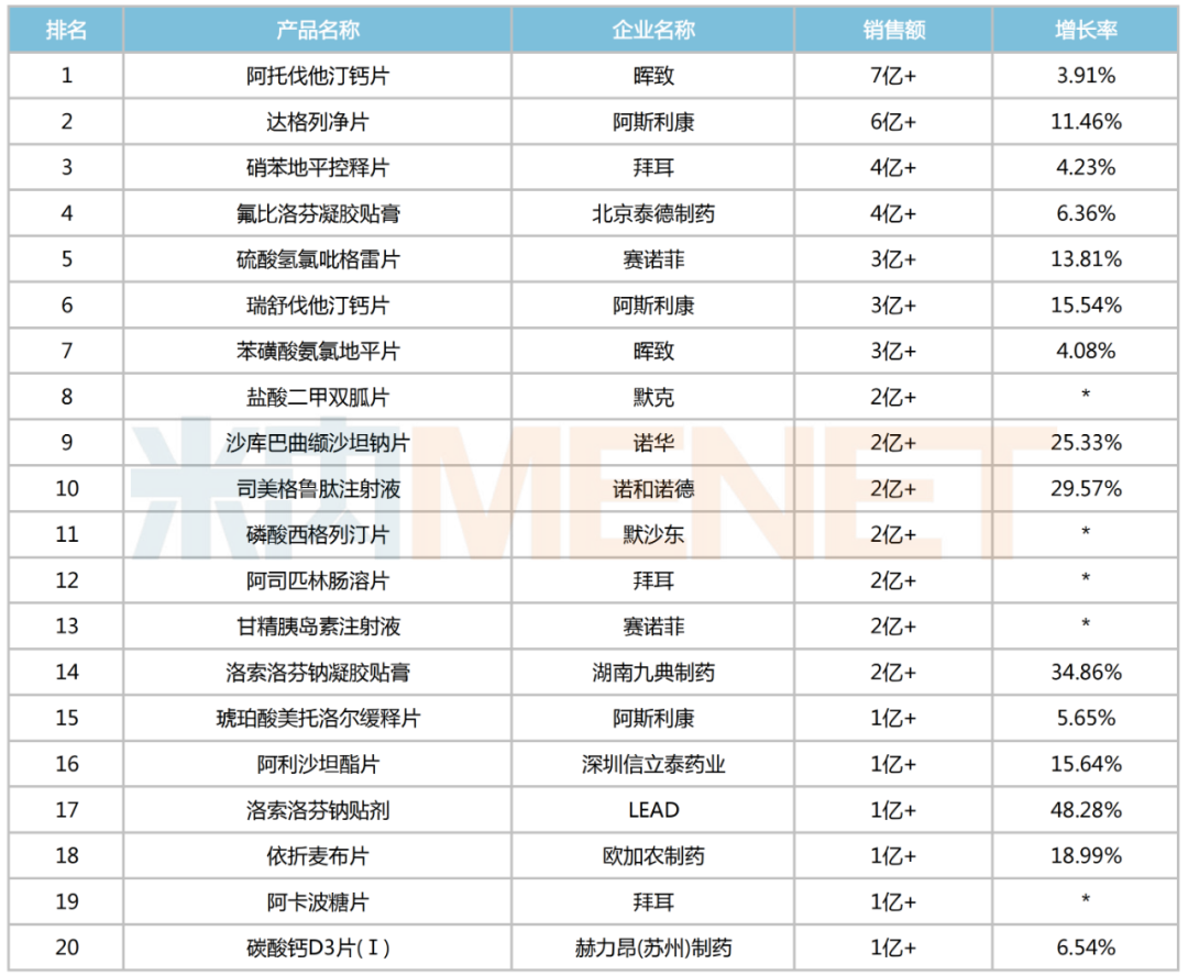 17个品牌销售额实现正增长,占比达85%;其中9个涨幅达两位数,包括:LEAD的洛索洛芬钠贴剂大涨48.28%、诺和诺德的司美格鲁肽注射液大涨29.57%、诺华的沙库巴曲缬沙坦钠片大涨25.33%、信立泰的阿利沙坦酯片增长15.64%等。