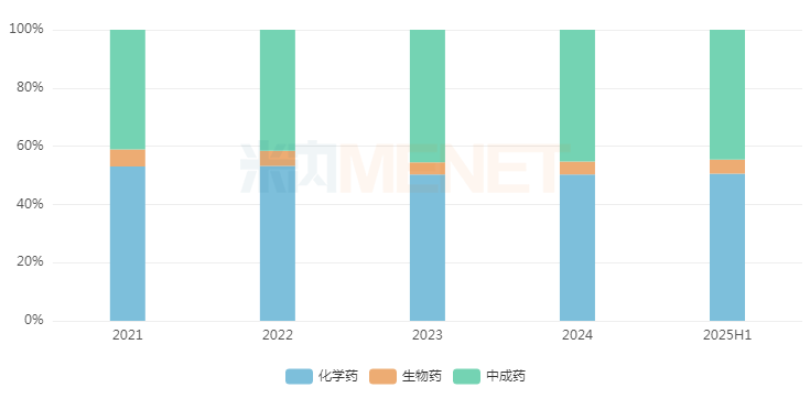 2025上半年药品类型格局方面,化药与中成药几乎“平分秋色”,市场份额分别超50%和44%;生物药仍处于低位水平,市占比约5%,这也与城市社区以针对基础疾病、慢病为主的用药结构有关。
