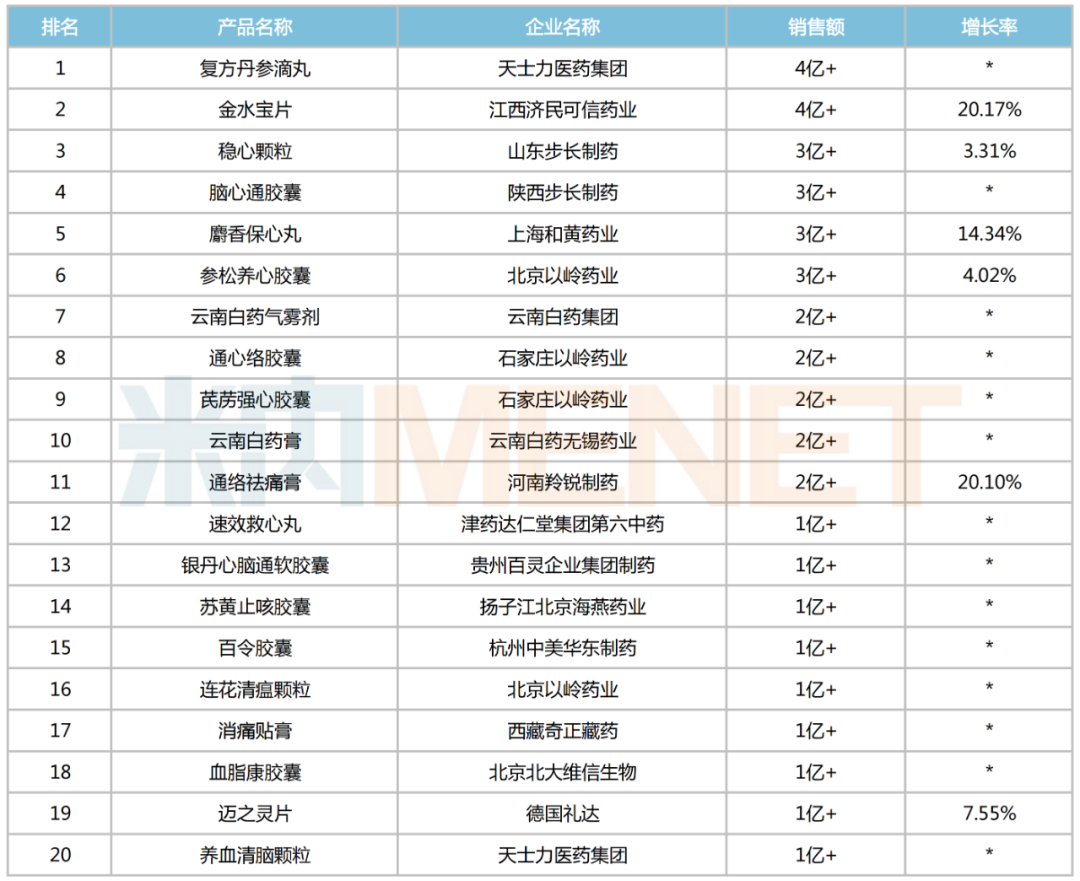 中成药TOP20品牌中,TOP6品牌销售门槛超过3亿元,涉及天士力的复方丹参滴丸、步长制药的稳心颗粒和脑心通胶囊、上海和黄药业的麝香保心丸等;9个品牌销售额呈正增长,其中羚锐制药的通络祛痛膏大涨20.1%、上海和黄药业的麝香保心丸增长14.34%。