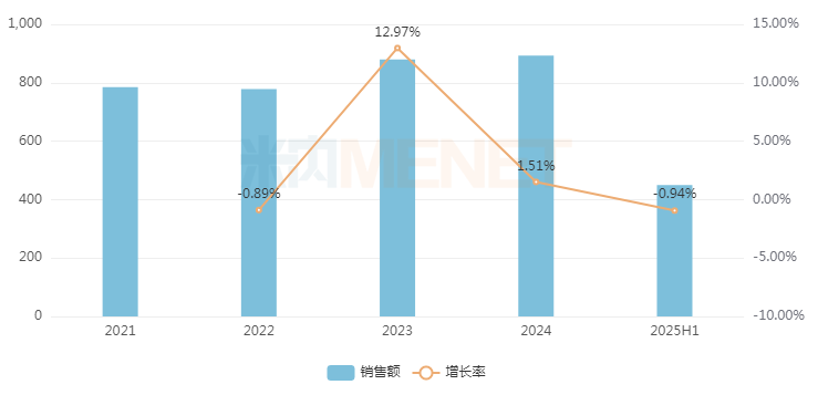 我国城市社区药品市场主要由慢病药、常见病药等基础用药组成,总体受集采等政策影响不大,销售市场近年亦呈稳步发展之势。米内网数据显示,其2023-2024年销售额分别同比增长12.97%和1.51%,2025上半年略有0.94%的回落至约450亿元。