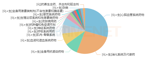 从化药及生物药大类格局上看,两个品类市场份额均达两位数,其中心脑血管系统药物占比超过30%,消化系统及代谢药占比超过28%,两者合计份额接近六成。