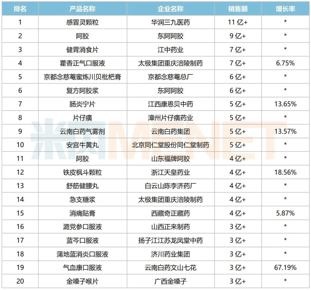 从增长情况看,4个品牌涨逾10%,其中云南白药文山七花的气血康口服液大涨67.19%;从企业上榜情况看,华润医药有4个品种在列,分别为居于首位的感冒灵颗粒、第二位的阿胶、第三位的健胃消食片以及第六位的复方阿胶浆,国药集团、云南白药均有2个品种在列,康恩贝、扬子江、片仔癀、济川药业、太极集团等亦有独家品种在列。