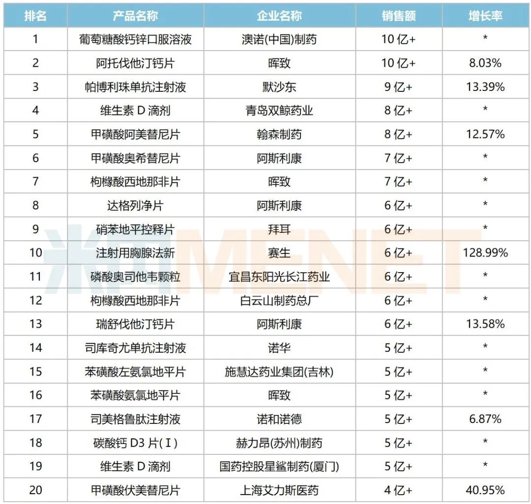 2025年上半年中国城市实体药店市场化药及生物药TOP20品牌合计销售额超过130亿元,其中澳诺(中国)制药的葡萄糖酸钙锌口服溶液、晖致的阿托伐他汀钙片稳居第一、第二位,销售额均超过10亿元;默沙东的帕博利珠单抗注射液以超9亿元排位第三,较2024年提升1个位次。