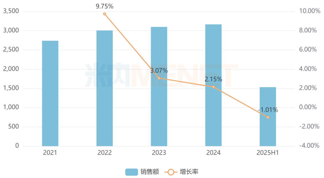 近年来(2016-2024年),在抗肿瘤药、生物药等新特药推动下,中国城市实体药店市场药品销售额呈逐年上涨态势,但这一趋势在2025年上半年迎来变动。米内网数据显示,2024年该市场药品销售额超过3100亿元,同比增长2.15%;2025年上半年超过1500亿元,同比下滑1.01%。