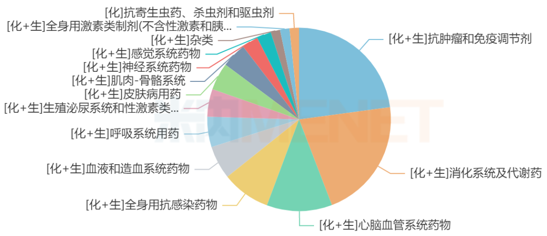 从化药及生物药大类分布看,抗肿瘤和免疫调节剂稳居首位,占比由2016年的约5%持续提升至2025年上半年的约24%;以糖尿病用药为主的消化系统及代谢药紧接其后,近年来占比均超过22%;以高血压用药为主的心脑血管系统药物排位第三,近年来占比均超过11%。