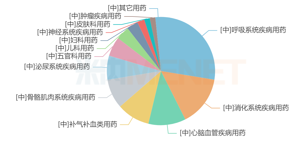 从中成药大类分布情况看,呼吸系统疾病用药“称王”,占比接近28%;其次是消化系统疾病用药,占比超过15%;心脑血管疾病用药、补气补血类用药依次位列第三、第四,占比均超过10%。