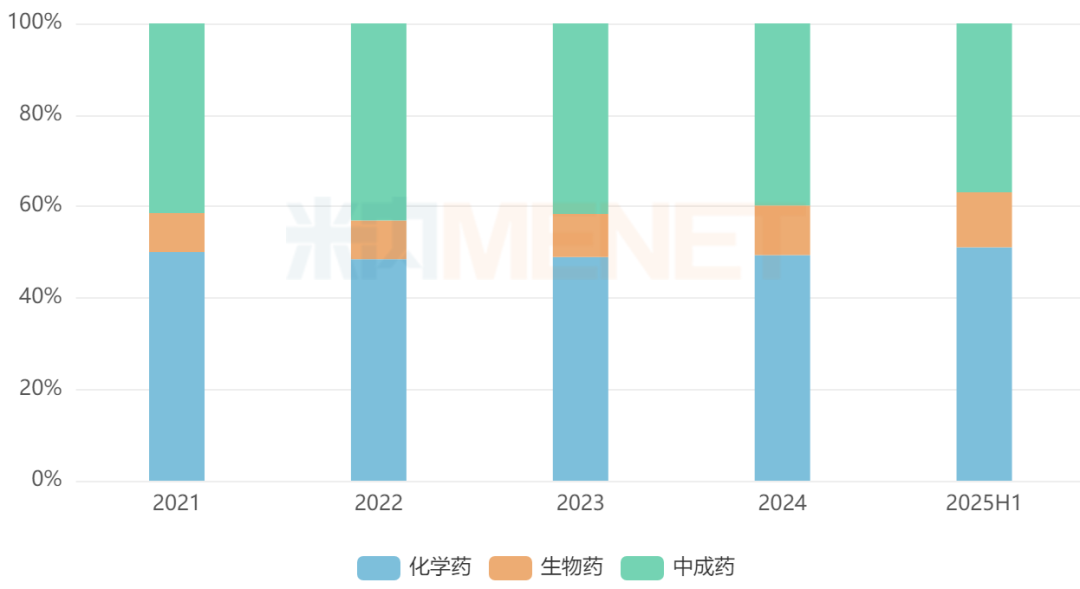 中国城市实体药店市场以化学药为主,2025年上半年占比突破50%;中成药紧接其后,但占比由2022年的约43%下滑至2025年上半年的约37%;在新特药推动下,生物药发展迅猛,占比由2022年的约8%提升至2025年上半年的约12%。