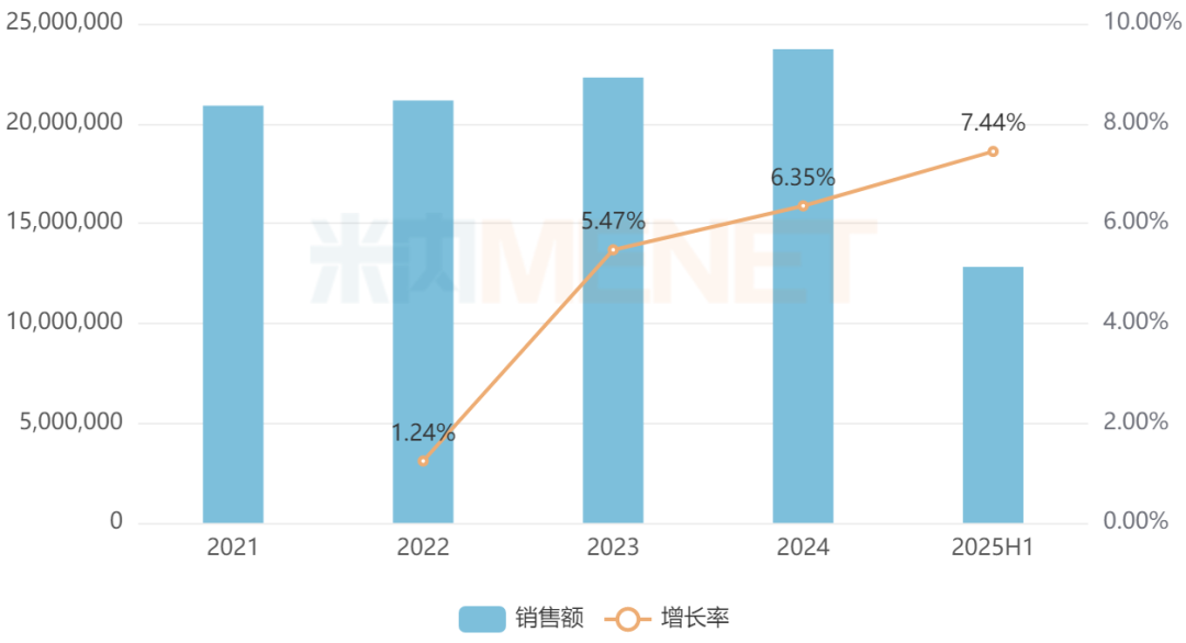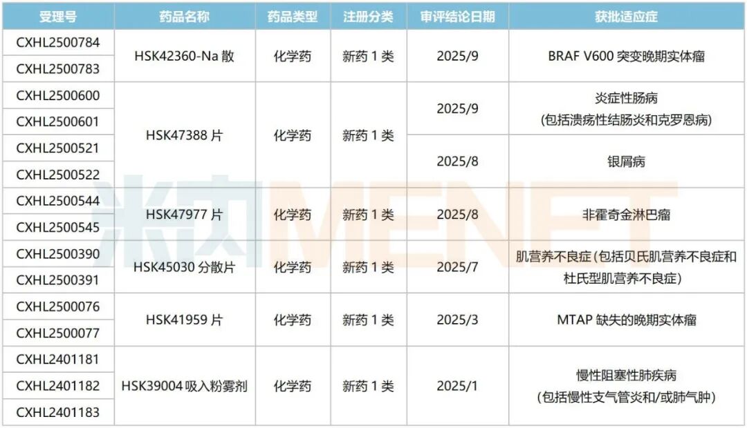 从治疗领域看,HSK42360-Na散、HSK47977片、HSK41959片、HSK47388片均为抗肿瘤和免疫调节剂。米内网数据显示,2025年上半年中国三大终端六大市场(统计范围详见本文末)抗肿瘤和免疫调节剂(化药+生物药)销售额超过1200亿元,同比增长7.44%。