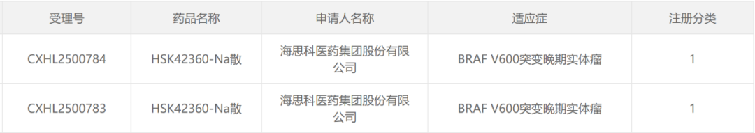 HSK42360-Na散是海思科医药开发的一款化药1类创新药,其临床申请于今年7月获得CDE承办受理,并于9月获得临床试验默示许可,用于治疗BRAF V600突变晚期实体瘤。