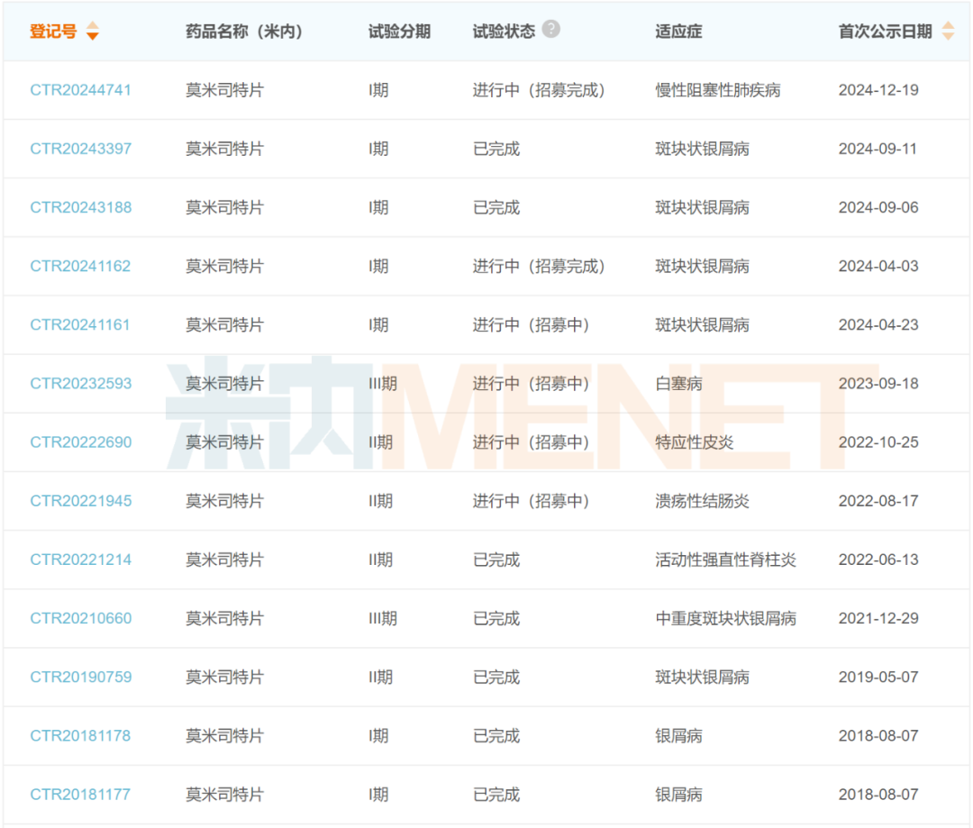 据悉,莫米司特片于2016年12月首次进入临床阶段,目前已在国内登记了10余项临床试验;2023年7月,莫米司特片完成中重度斑块状银屑病适应症的III期临床试验,并于2024年4月提交NDA,2025年10月顺利获批上市。