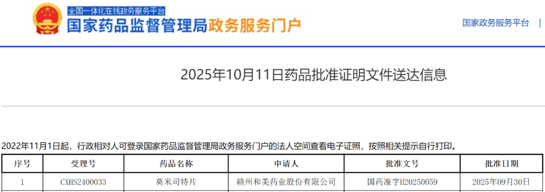 10月11日,国家药监局官网显示,赣州和美药业申报的1类新药莫米司特片获批上市,为国内获批的首款自主研发的PDE4小分子创新药,为斑块状银屑病(PS)患者带来新的治疗选择。