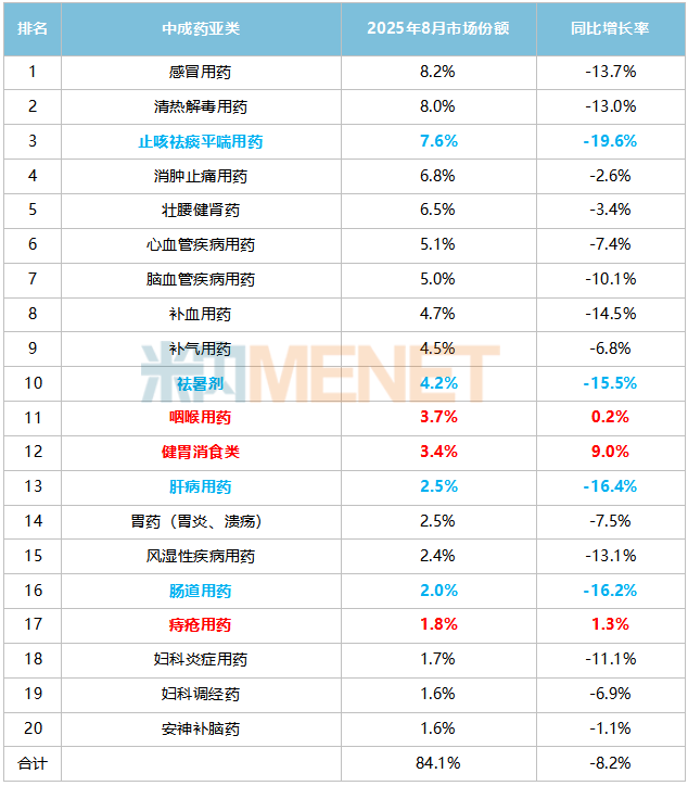 2025年8月,中成药TOP20品类份额为84.1%,市场集中度提升了1个百分点。从销售规模上看,销售规模较上月下降5.8%,与同期相比下降了8.2%。