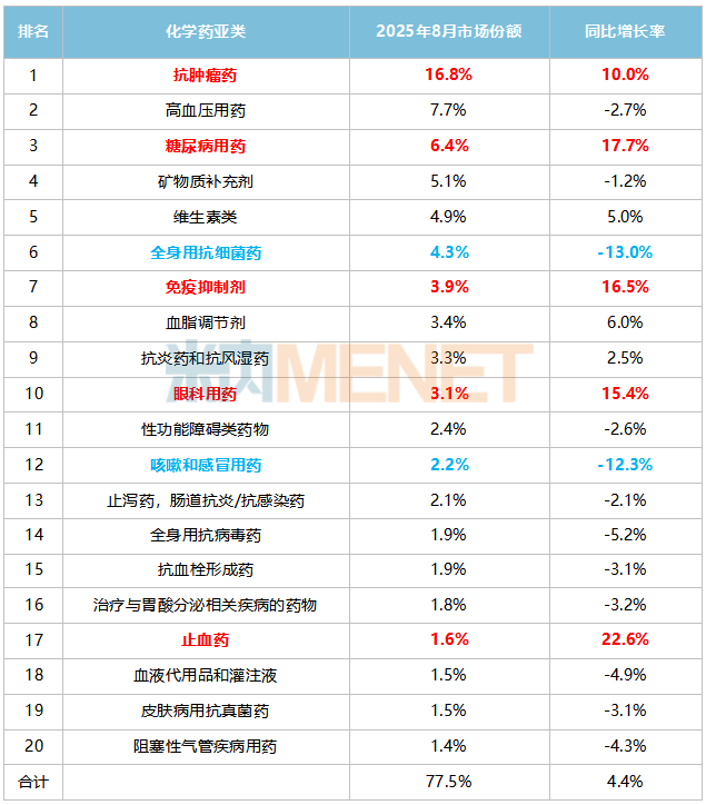 2025年8月,化学药TOP20品类销售规模占77.5%的份额,销售份额较上月下降0.5%,从增长率来看,同环比均有上升,环比上升了3.9%,同比有4.4%的增长。