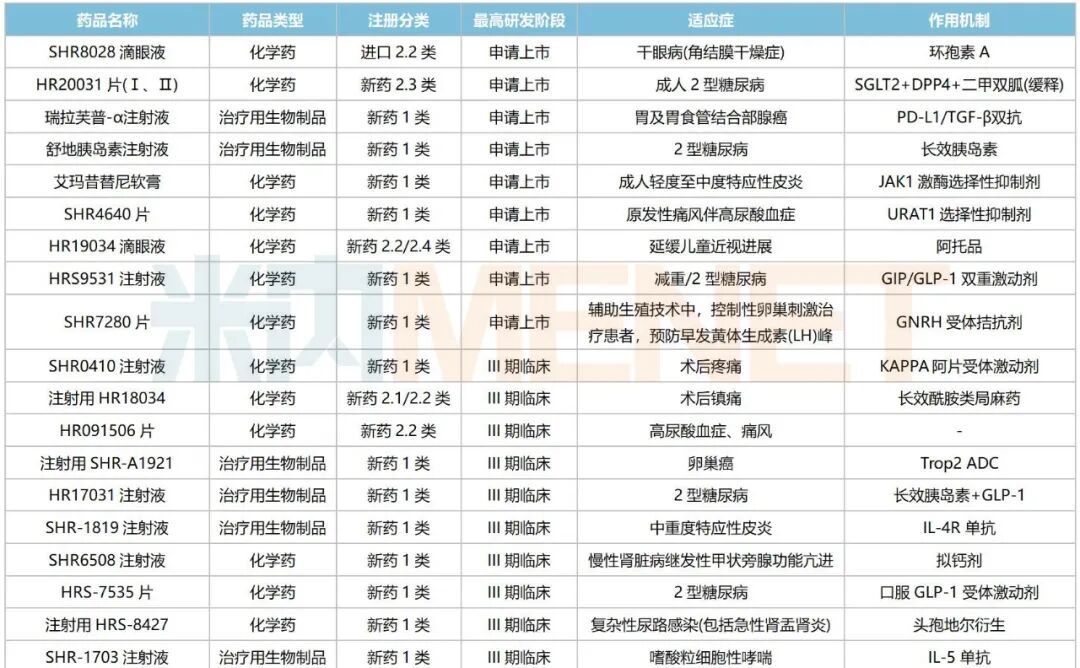 6款为糖尿病/减肥用药,其中SGLT2+DPP4+二甲双胍三药复方制剂HR20031片(Ⅰ、Ⅱ)、长效胰岛素舒地胰岛素注射液、GIP/GLP-1双重激动剂HRS9531注射液分别于2023年11月、2025年1月、2025年9月提交NDA,目前国内暂无国产GIP/GLP-1双重激动剂获批,恒瑞医药有望首个获批。