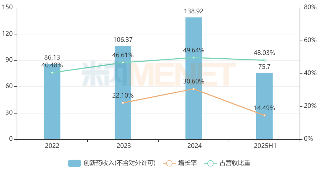 值得一提的是,2025年上半年恒瑞医药创新药收入达75.7亿元(含税,不含许可收入),同比增长约14.5%,占营业收入比重约48%,若加上许可收入,则其创新药收入占比超过60%。近年来,公司持续推动创新转型,创新药收入均以两位数的增速逐年增加,由2022年的约86亿元持续增长至2024年的约139亿元,2025年有望再创新高,可见创新药收入已然成为公司业绩增长的主要引擎。