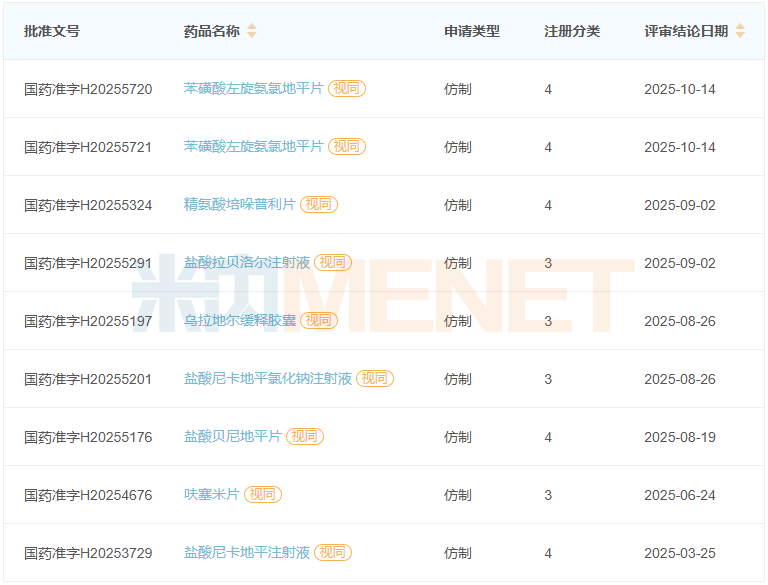 米内网数据显示,苯磺酸左氨氯地平片有23家企业拥有生产批文,石家庄四药、山东鲁抗医药等22家企业过评,海南斯达制药、湖南千金湘江药业等26家企业以仿制4类报产在审,获批后视同过评。