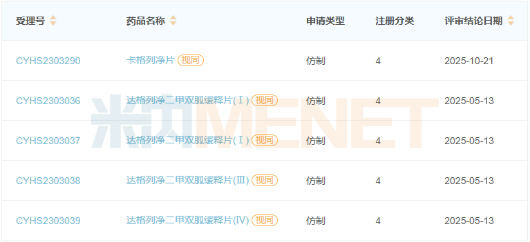 米内网数据显示,卡格列净片有12家企业拥有生产批文,浙江华海药业、山东凤凰制药、杭州中美华东制药等11家企业过评,江苏华鑫制药、江西同和药业、浙江诺得药业均以仿制4类报产在审,获批后视同过评。