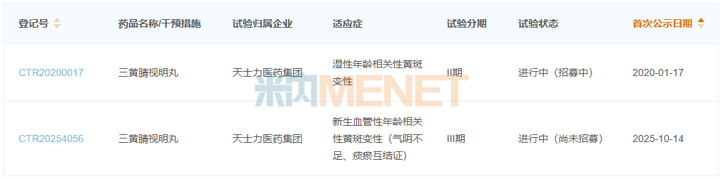 天士力医药集团于2018年3月提交了该新药的临床申请,并于同年7月获批,随后在2020年1月启动湿性年龄相关性黄斑变性II期临床,2025年10月启动新生血管性年龄相关性黄斑变性(气阴不足、痰瘀互结证)III期临床,离申报上市又近了一步。