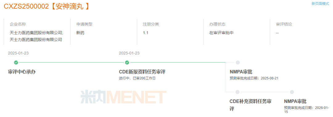 目前,天士力医药集团报产在审的中药新药还有安神滴丸,该项目源自国医大师张伯礼院士的临床经验方,用于治疗失眠症,定位于改善失眠症患者时睡时醒和睡眠不深,以及失眠导致的日间功能障碍,米内网预测该新药或将在明年1月迎来好消息,值得期待。
