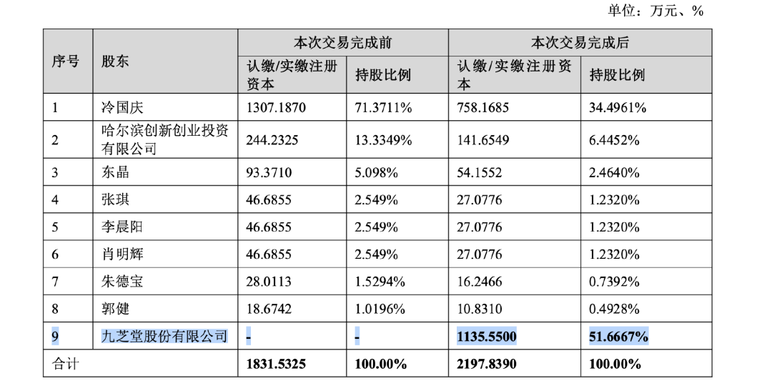 编辑说:10月30日,九芝堂发布《关于对外投资的公告》,拟以2.1亿元受让吉象隆现有股东冷国庆、哈尔滨创新、东晶、 张琪、李晨阳、肖明辉、朱德宝、郭健合计持有的吉象隆已实缴注册资本769.2435万元(对应本次交易完成后35%的标的公司股权),并以1亿元认购吉象隆366.3065万元的新增注册资本(对应本次交易完成后16.6667%的标的公司股权)。