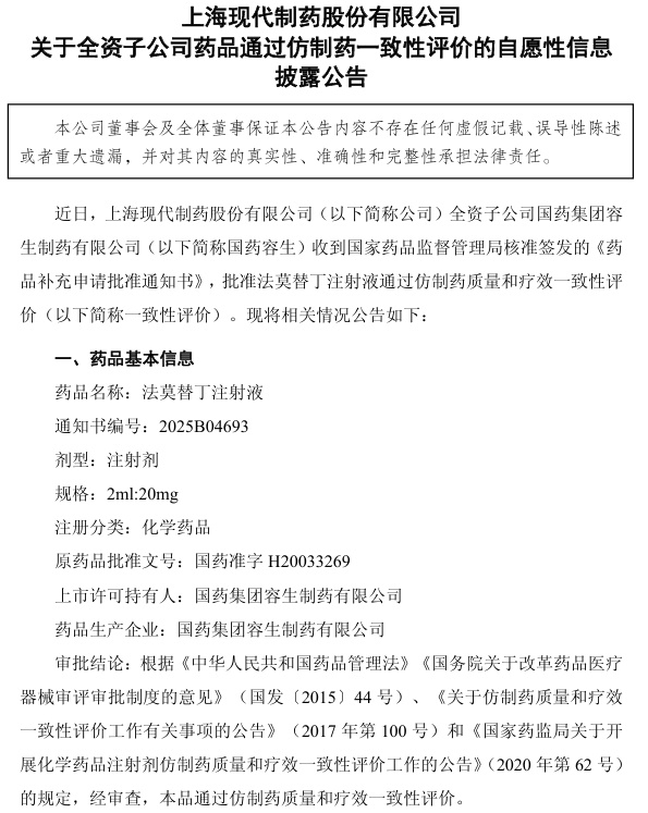 在此之前,国药现代的产品捷报不断,其全资子公司国药集团容生制药的盐酸林可霉素注射液、法莫替丁注射液先后过评,这将有利于2款产品未来的市场拓展和销售。其中,法莫替丁注射液在2024年中国三大终端六大市场销售额超过5亿元,国药集团容生制药的市场份额最大。