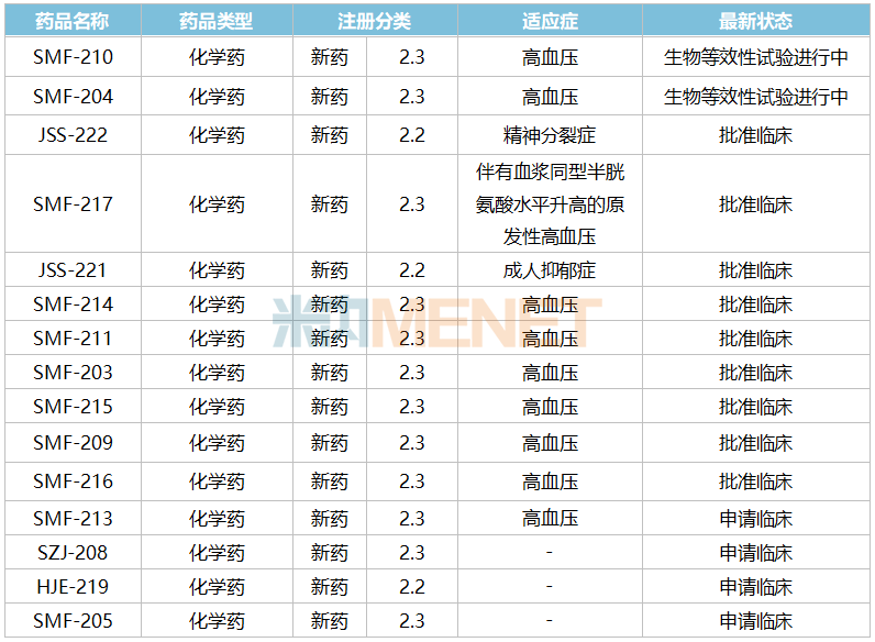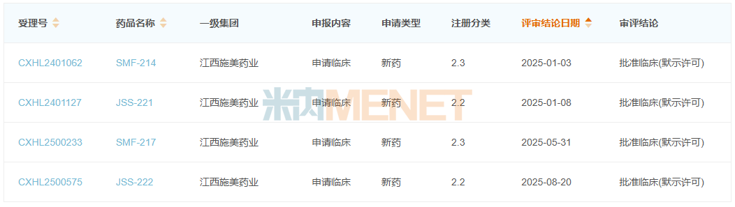 2025年至今,江西施美药业再有4款化药2类新药首次获批临床,其中SMF-214是一款血管紧张素转换酶抑制剂与钙通道阻滞剂组成的改良新药,用于治疗高血压;JSS-222是一款针对多巴胺D2受体、5-HT7/5-HT1A/5-HT2A受体和ɑ2受体的改良新药,用于治疗精神分裂症。
