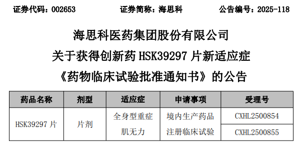 HSK39297片是由海思科自主研发的化药1类创新药,拟用于全身型重症肌无力。该新药的临床申请(CXHL2500854/5)于2025年8月获得CDE承办,随后于今年11月获得临床试验默示许可。