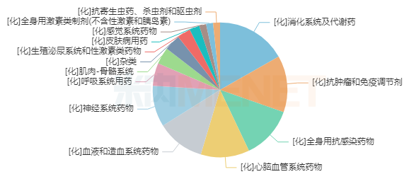 在中国三大终端六大市场(统计范围详见本文末),2021-2024年化药销售规模均超过10000亿元,整体发展比较平稳;2025H1同比略有下滑至超5000亿元,从大类格局上看,消化系统及代谢药、抗肿瘤和免疫调节剂、全身用抗感染药物、心脑血管系统药物、血液和造血系统药物、神经系统药物等品类市场份额均超过10%。