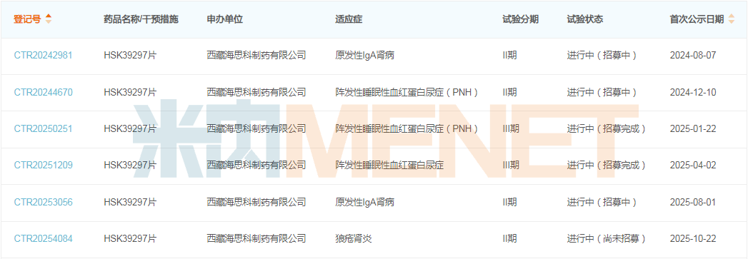 米内网数据显示,此前HSK39297片已有2项适应症处于临床研究阶段,其中拟用于阵发性睡眠性血红蛋白尿症(PNH)适应症已步入Ⅲ期临床,拟用于原发性IgA肾病、狼疮肾炎适应症已步入Ⅱ期临床;1项适应症申报IND在审,为拟用于治疗年龄相关性黄斑变性(AMD)。