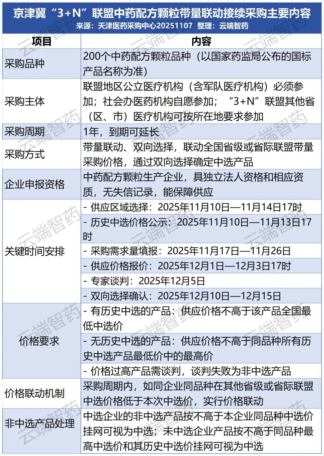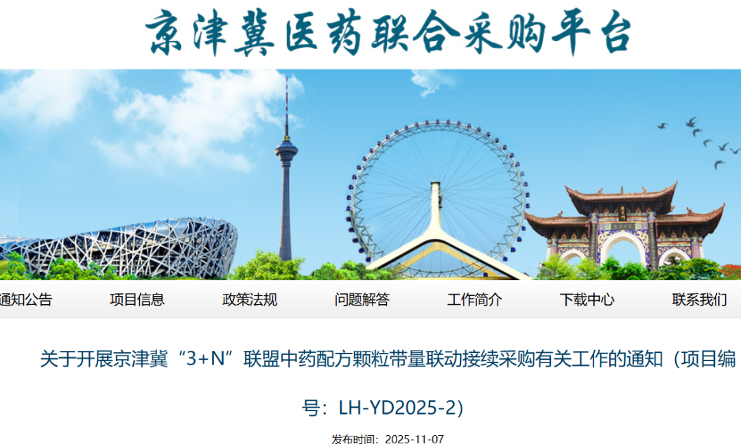 11月7日,天津医药采购中心发出《关于开展京津冀“3+N”联盟中药配方颗粒带量联动接续采购有关工作的通知》。