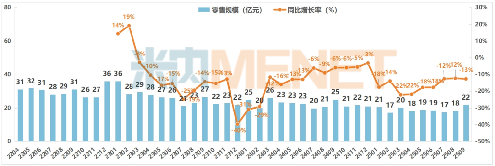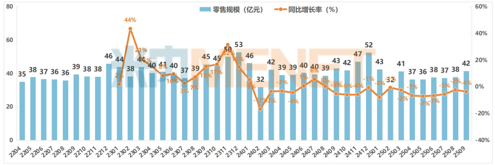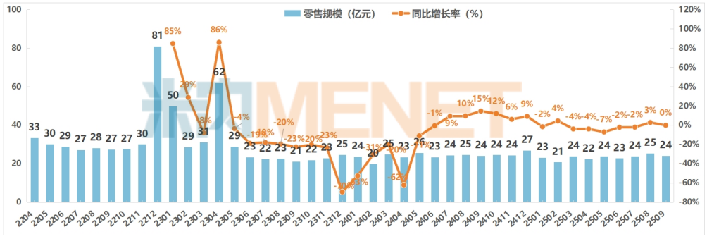 2025年9月全国实体药店医疗器械零售规模为24亿元,较8月有4.6%跌幅,与去年同期相比略跌0.2%,属于季度性震动,医疗器械的发展相对恒定。